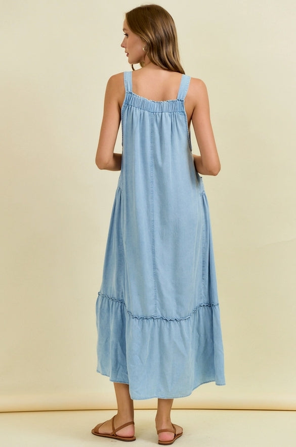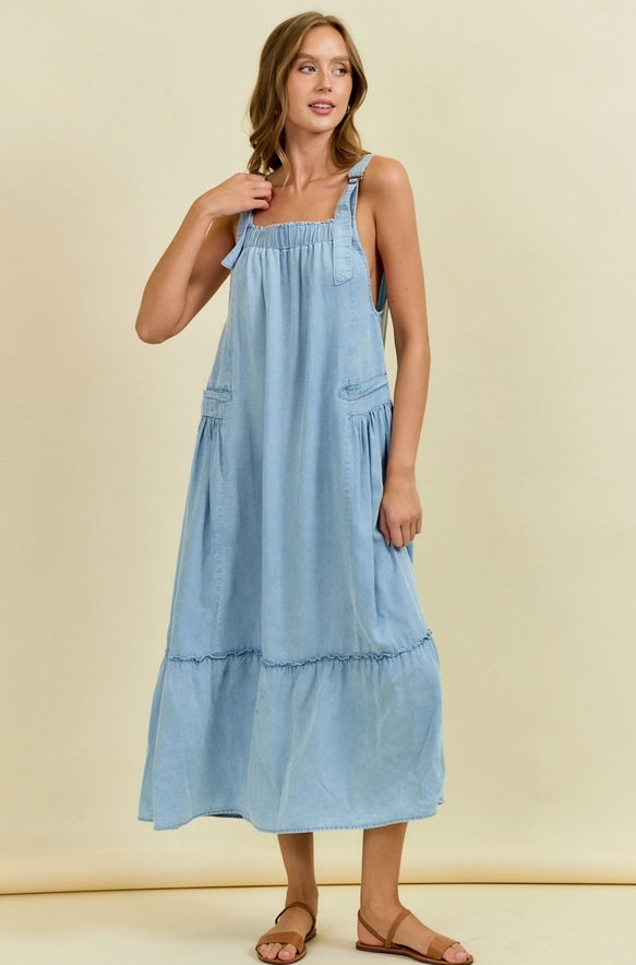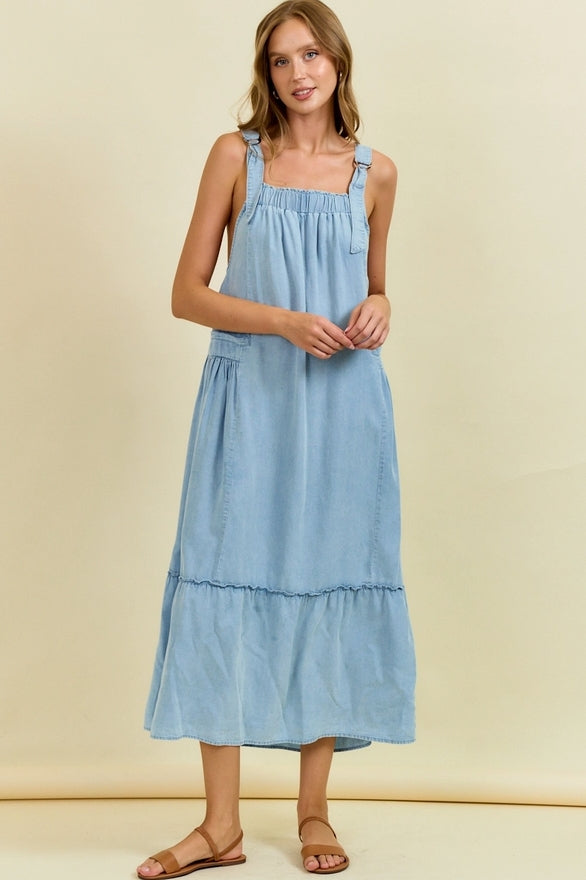 TENCEL MAXI OVERALL DRESS WITH TIERED RUFFLE - Relaxed, flowy midi dress design with a soft A-line silhouette, perfect for effortless everyday wear. - Features wide shoulder straps with ruched detailing at the neckline for a comfortable and feminine touch. - Crafted from lightweight denim fabric, available in light wash for versatile styling. - Finished with tiered skirt panels and subtle ruffle seam for added movement and style. - Side patch pockets add practical convenience without sacrificing the dress's easygoing charm. STYLE MEASUREMENTS (SIZE SMALL) -Total Length 52" -Bust 18" 100%TENCEL MODEL IS 5'10" | BUST 34" | WAIST 24" | HIPS 35" WEARING SIZE S