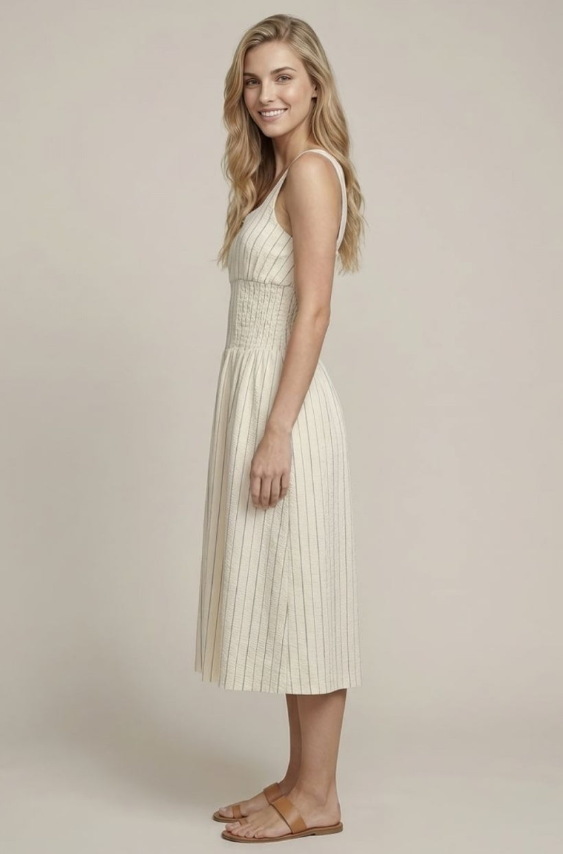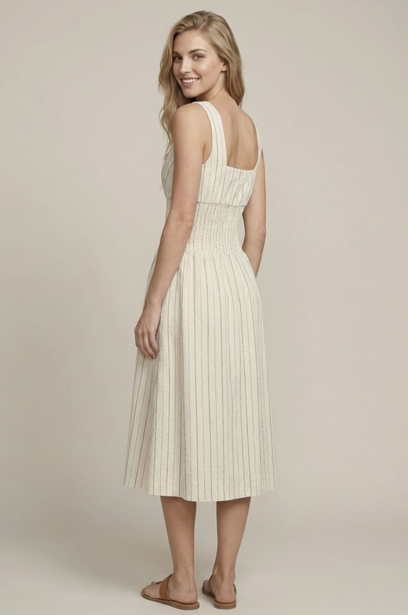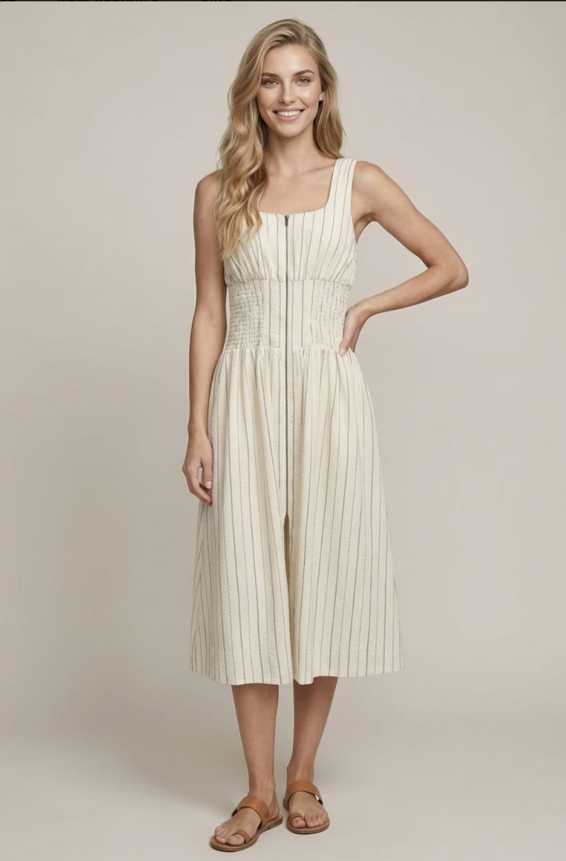 SCOOP NECK WAIST ZIP-FRONT MIDI DRESS W/ FULL LINED