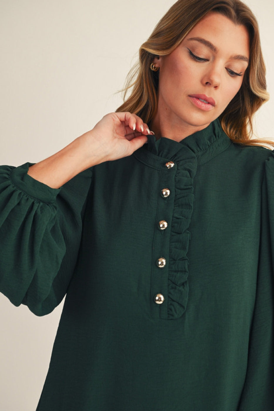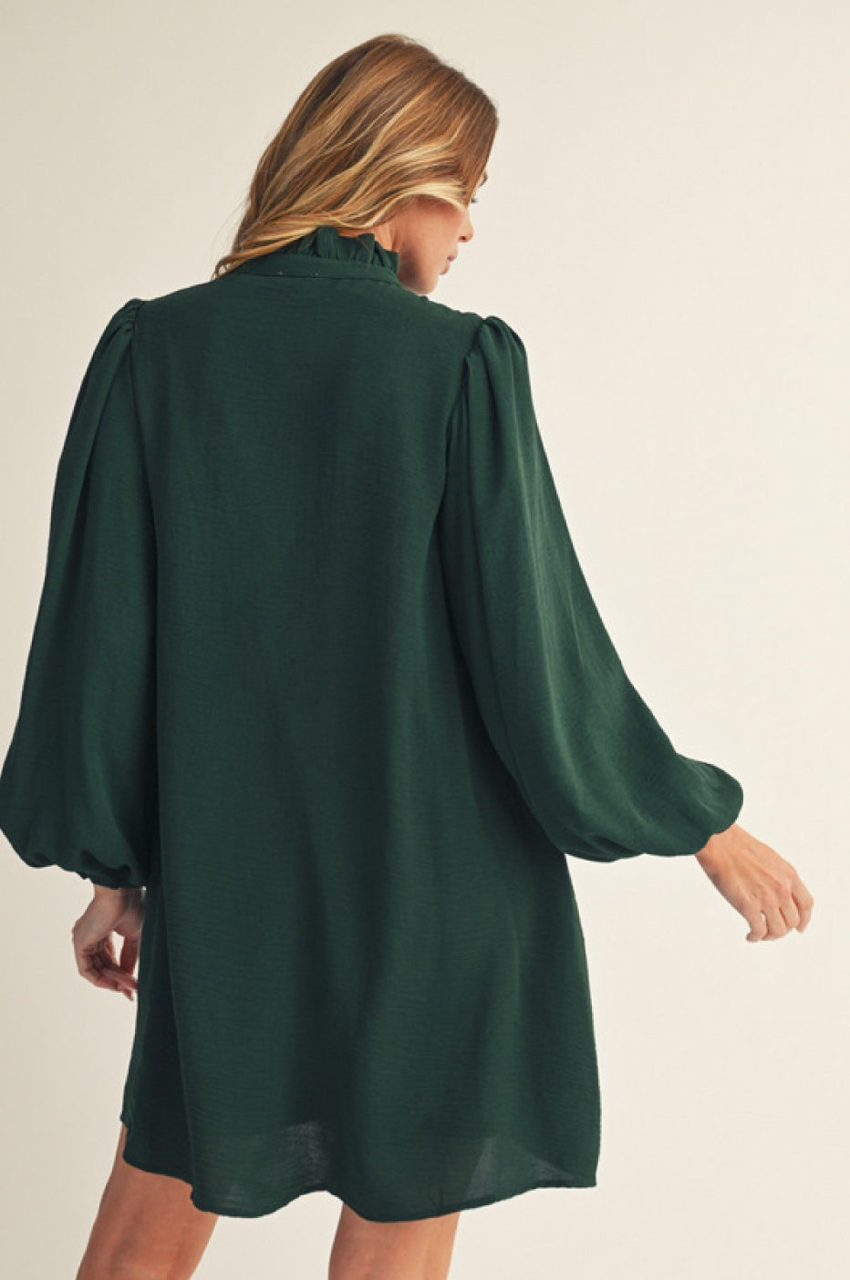 Long puff sleeves front button up shift dress with side pockets, ruffle detail.