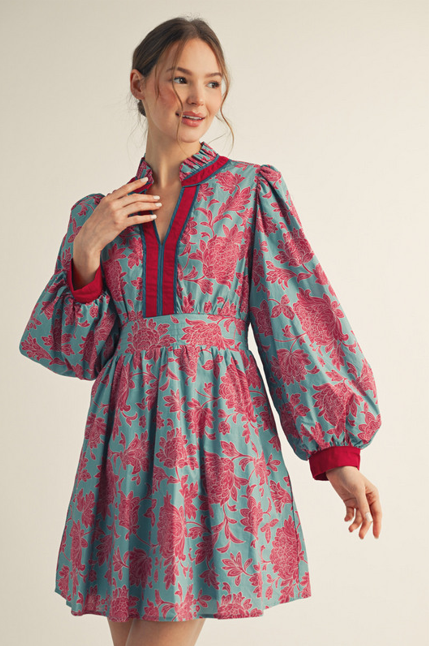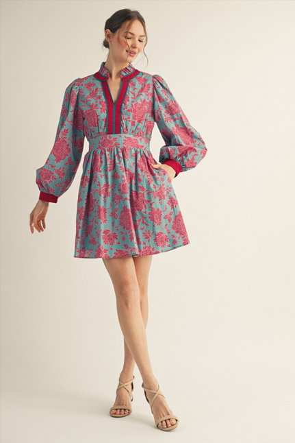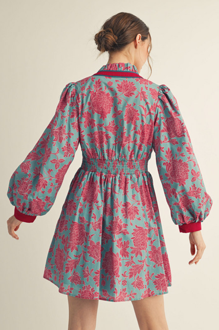 Long balloon sleeves floral dress with ruffled neckline, smocking waist back, solid contrast detail.