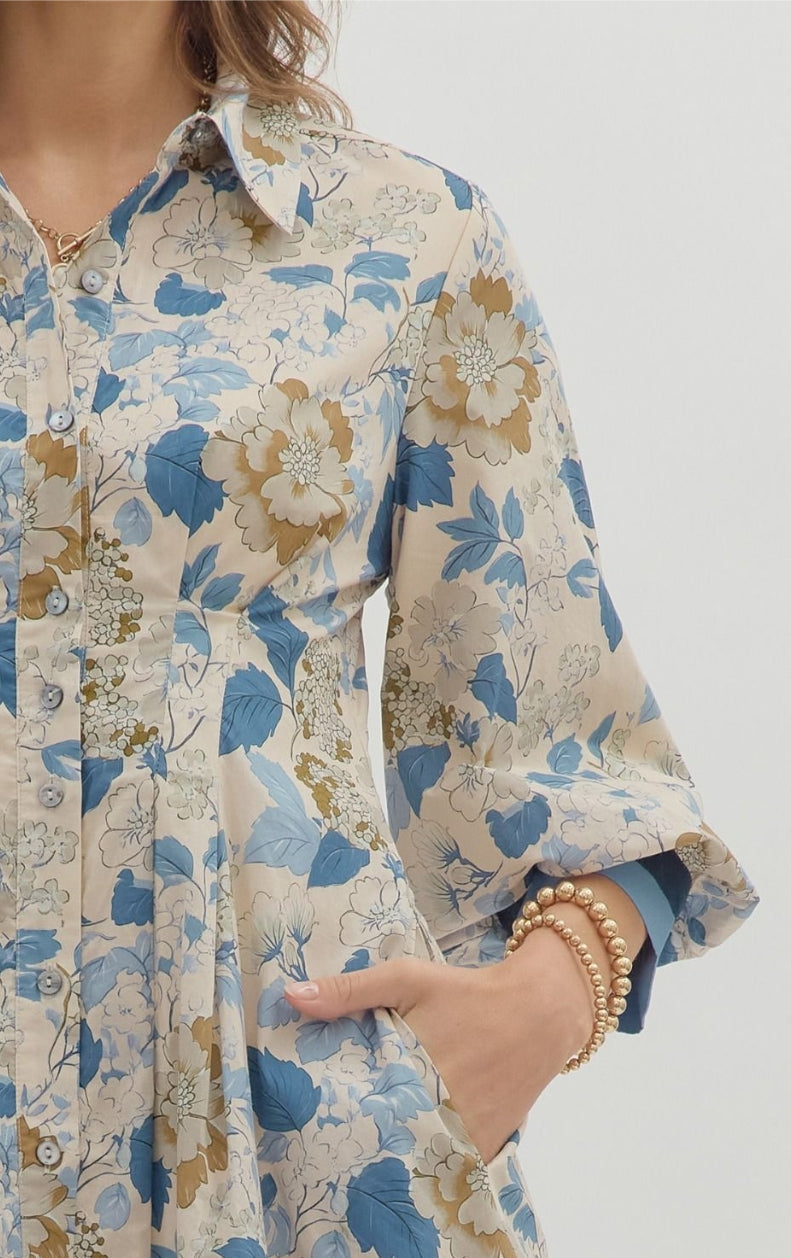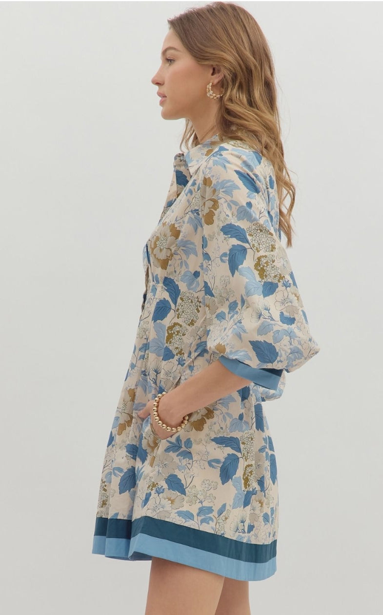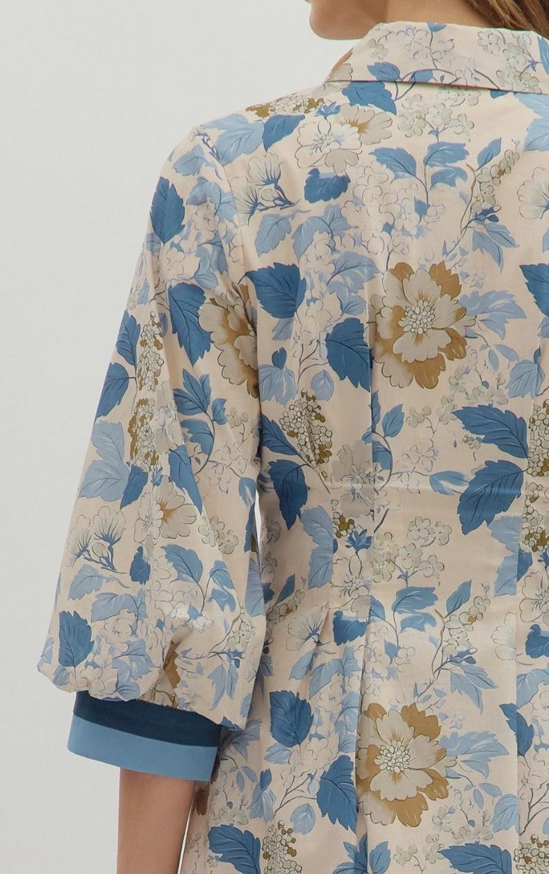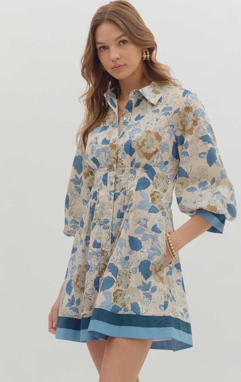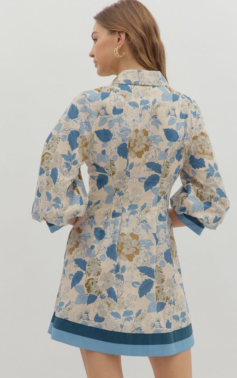 Floral print collar button closure ¾ bubble sleeve pintuck mini flare dress featuring multicolor accent sleeve band and hem. Side pockets. Lined. Woven. Non-sheer. Lightweight.