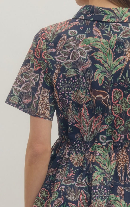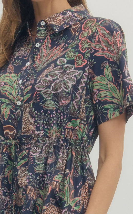 Animal print short sleeve mini dress featuring button placket at front. Drawstring waist with self-tie detail. Side pockets. Lined. Woven. Non-sheer. Lightweight.
