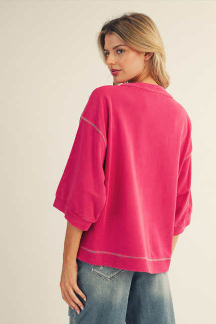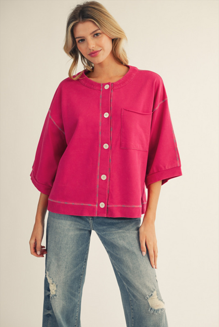 3/4 sleeves button down casual top, washed fabric, raw cut edge chest pocket, multi color stitch accent.