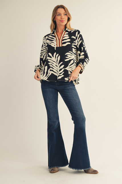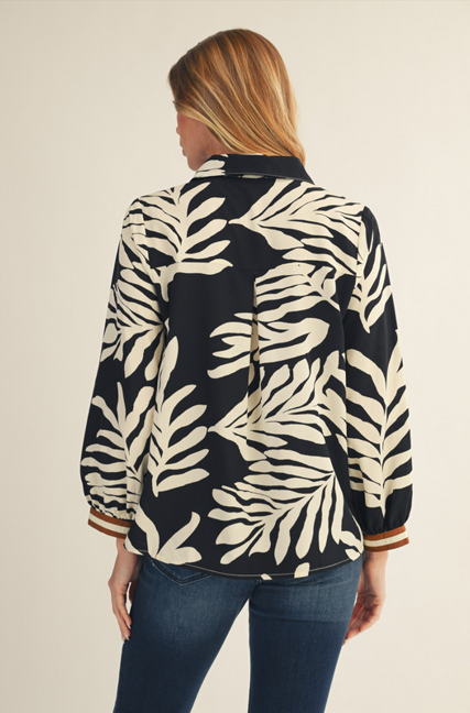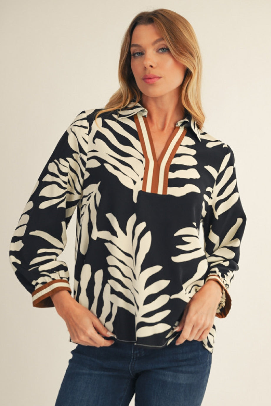 3/4 sleeves leaf print top with pleat back detail, v neck, collared neckline, stripe contrast detail.