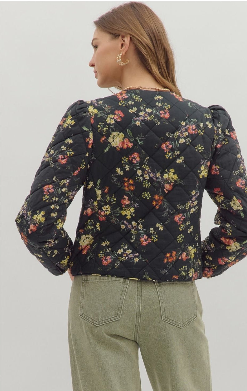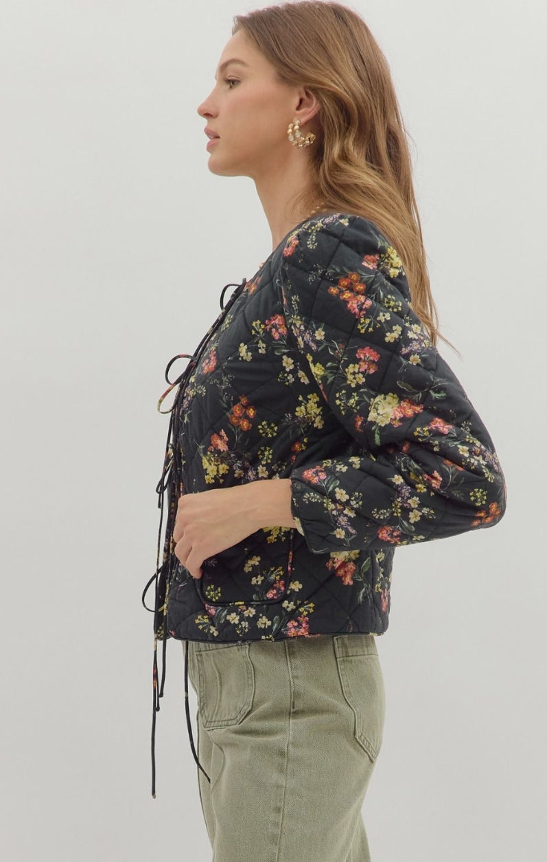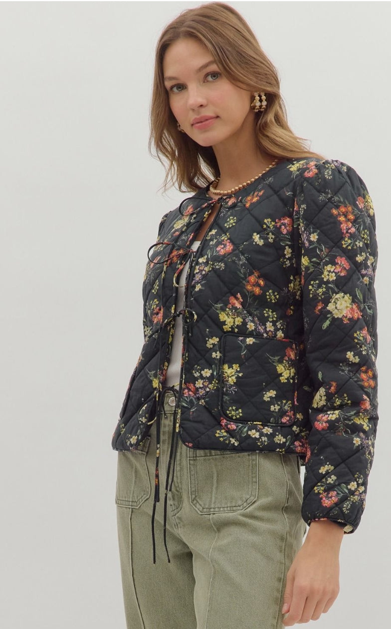 Floral print diamond pattern quilted long sleeve jacket featuring self bow tie closure at front. Patch pockets at front. Lined. Woven. Non-sheer. Lightweight.