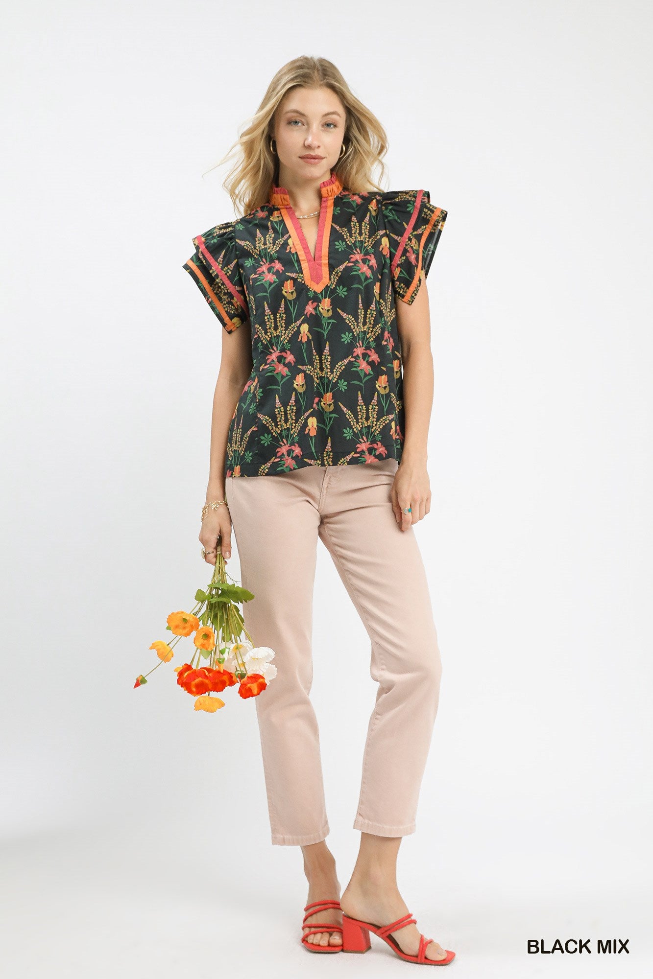 Mix Floral Print Blouse with Contrast Trim