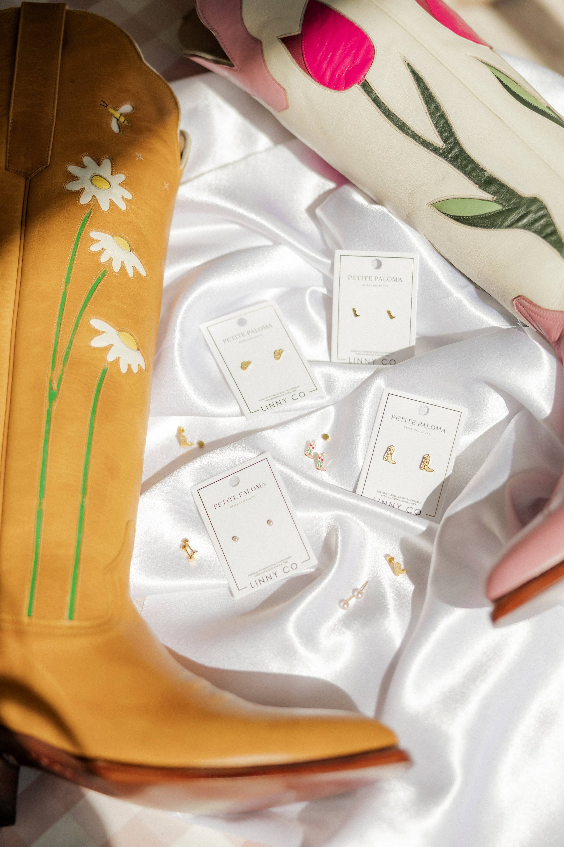 The Screwback Stud Earrings - Daisy Cowgirl Boot are part of a special collaboration with Petite Paloma Boots. These 10mm earrings feature a unique cowgirl boot design with CZ detailing in the center of the flower, adding a touch of sparkle to this western-inspired piece. The screw back earrings ensure a secure and comfortable fit, perfect for all-day wear. hypoallergenic and lightweight, these earrings are ideal for both teens and adults. Where to Wear: * Western-Themed Events: Perfect for adding a charming and unique touch to your outfit. * Casual Outings: Ideal for adding a playful yet refined accessory to your everyday look. * Gifts for Cowgirl Lovers: Pairs perfectly with your Petite Paloma Boots. Features: * 10mm cowgirl boot design with CZ detailing * Screwback earrings for a secure fit * hypoallergenic and safe for sensitive ears * Lightweight and comfortable for all-day wear