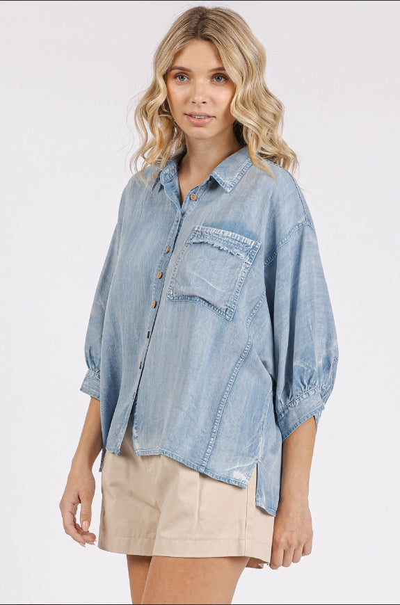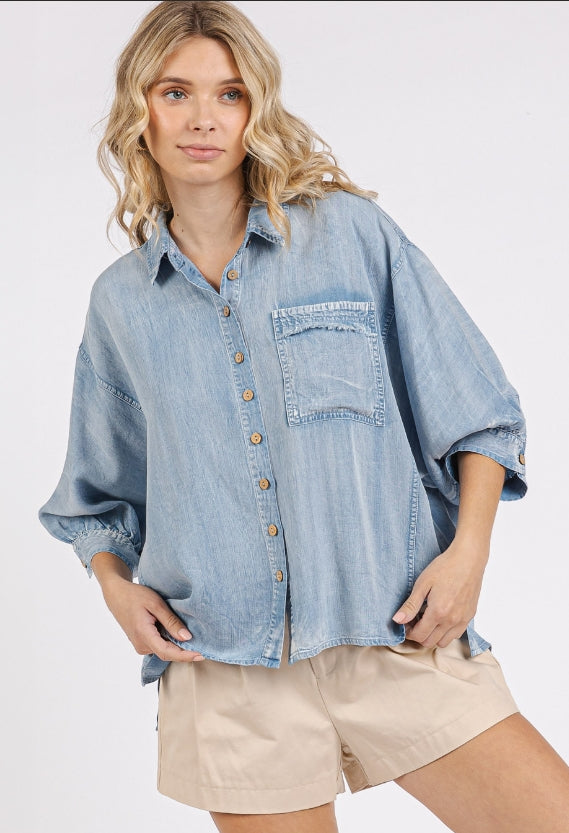 # spring, summer, button up shirt, blouse, top, collar, short sleeves, relaxed fit, washed denim, denim wash, boho, bohemian