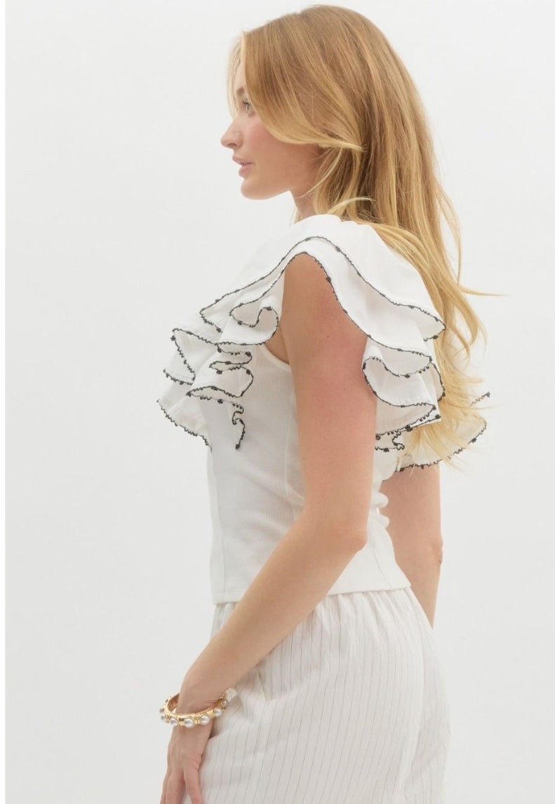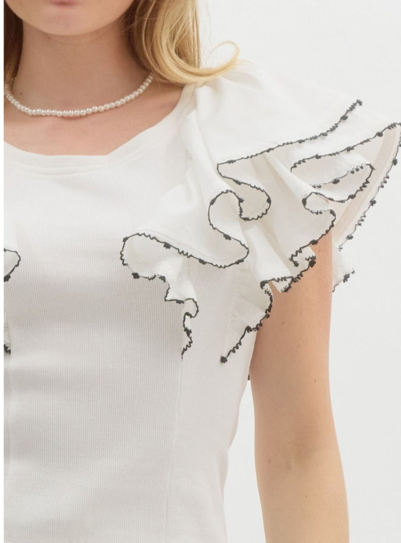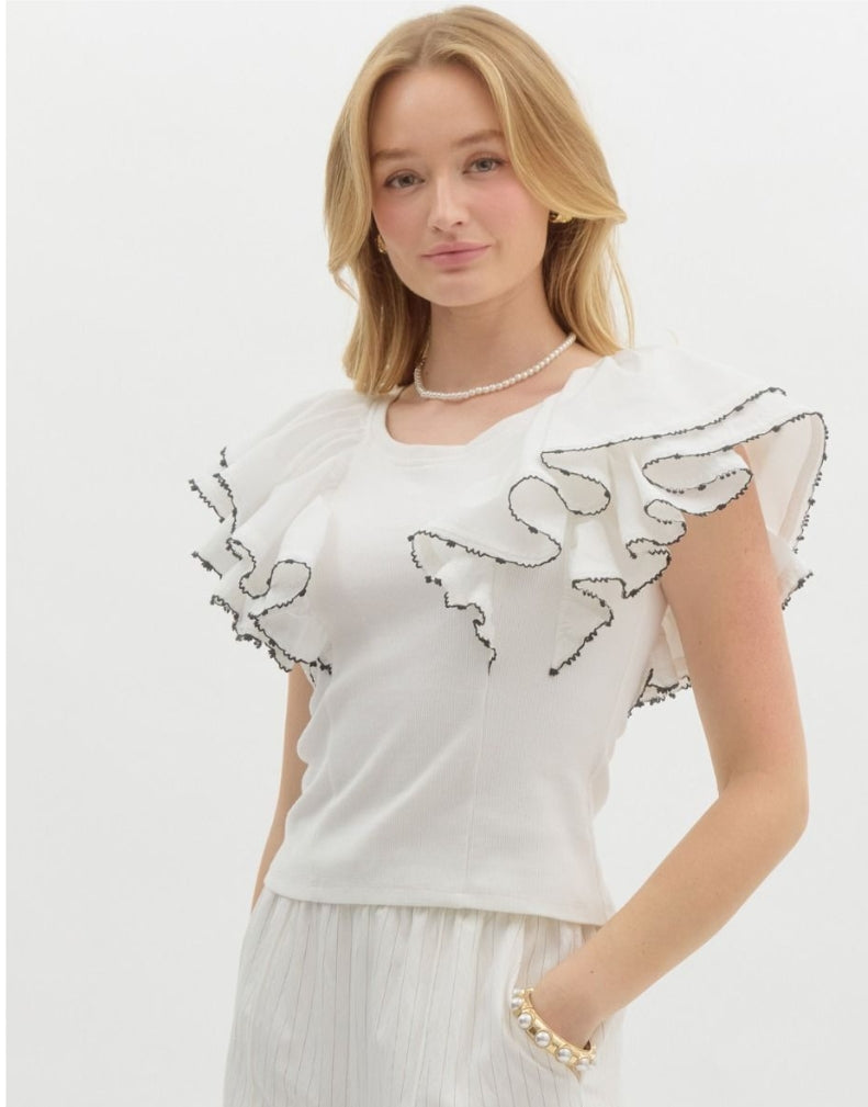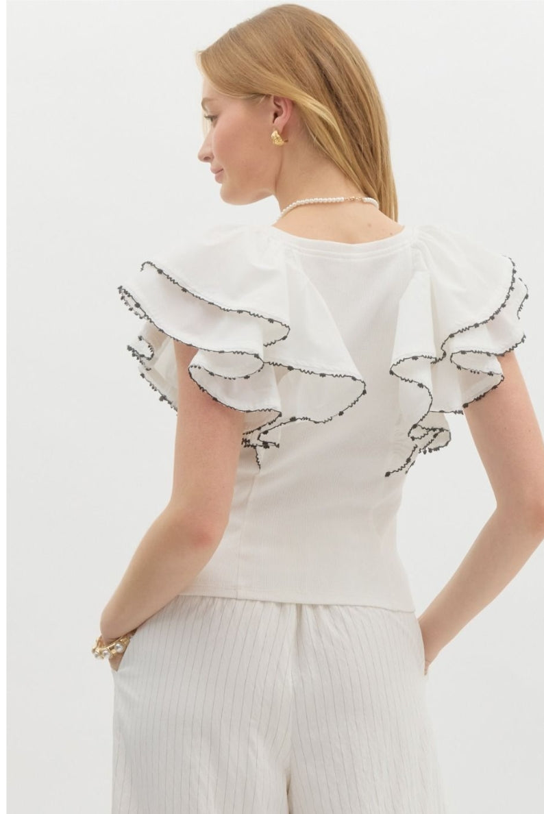 This white pullover features layered flutter sleeves with contrast scallop trim. Lightweight, non-sheer, and effortlessly chic.