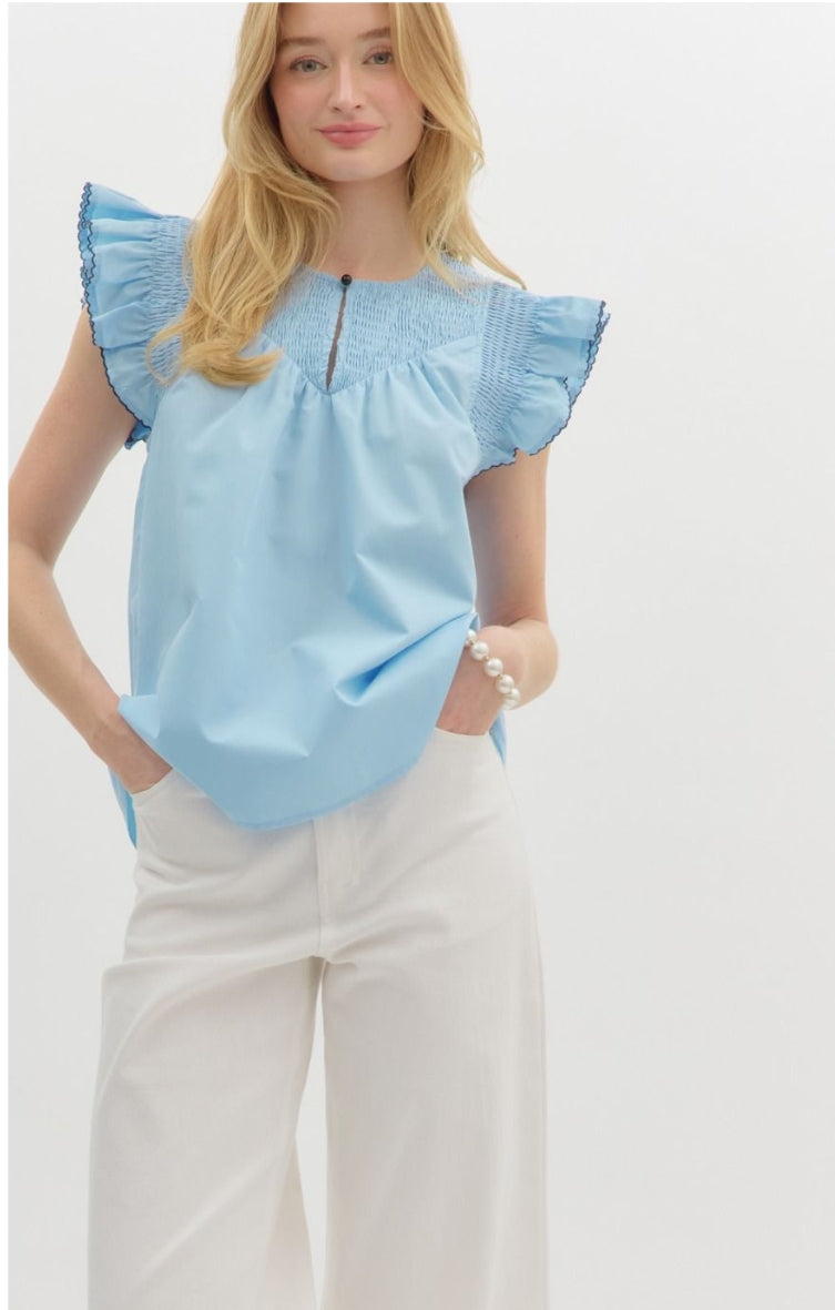Solid picot edge smocked flutter sleeve top featuring smocked V-yoke pearl button accented keyhole closure at front. Unlined. Woven. Non-sheer. Lightweight.