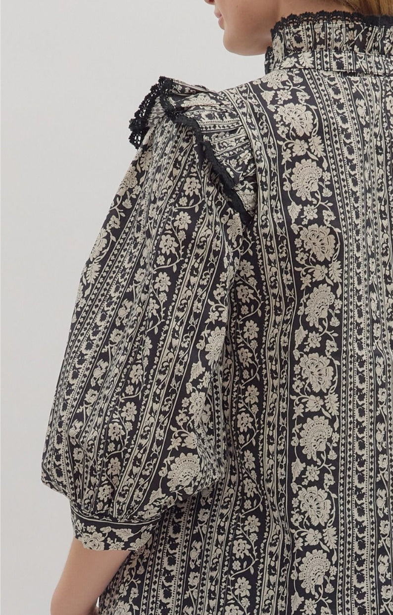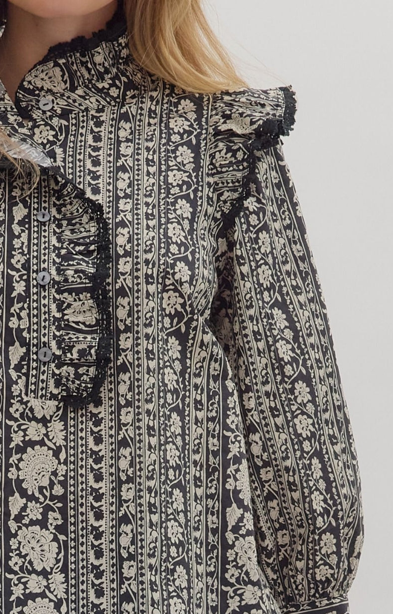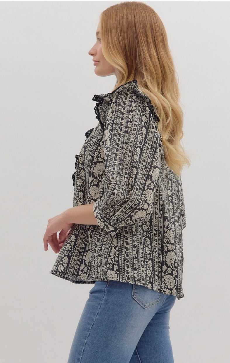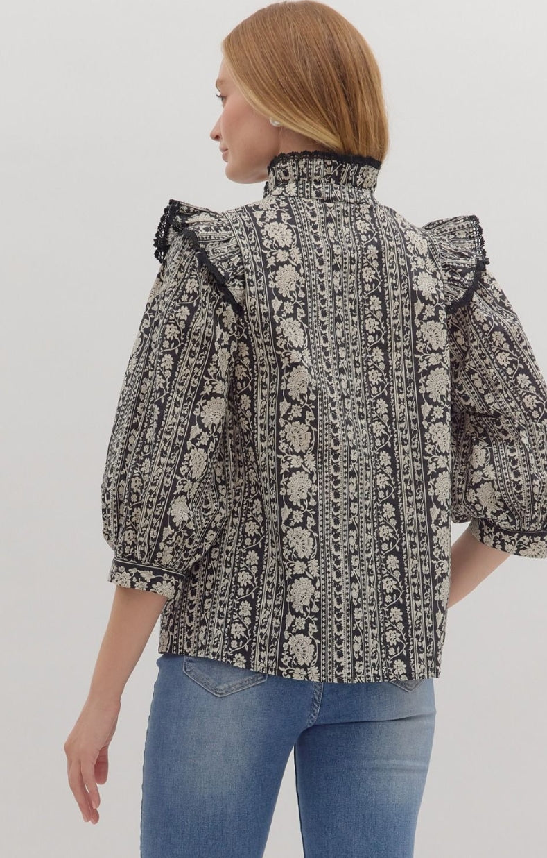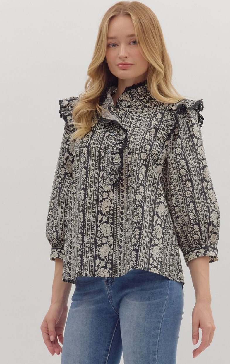 Floral stripe print ¾ sleeve top featuring ruffled mock neck with lace-trimmed shoulder flounce and front placket. Button closure at front. Unlined. Woven. Non-sheer. Lightweight.