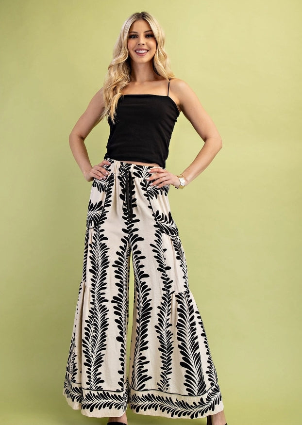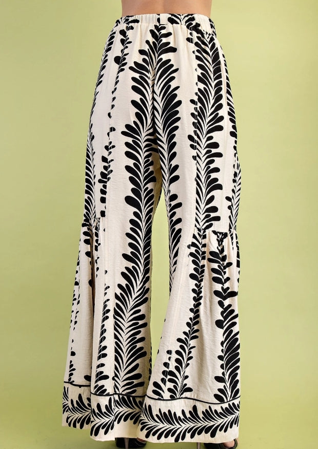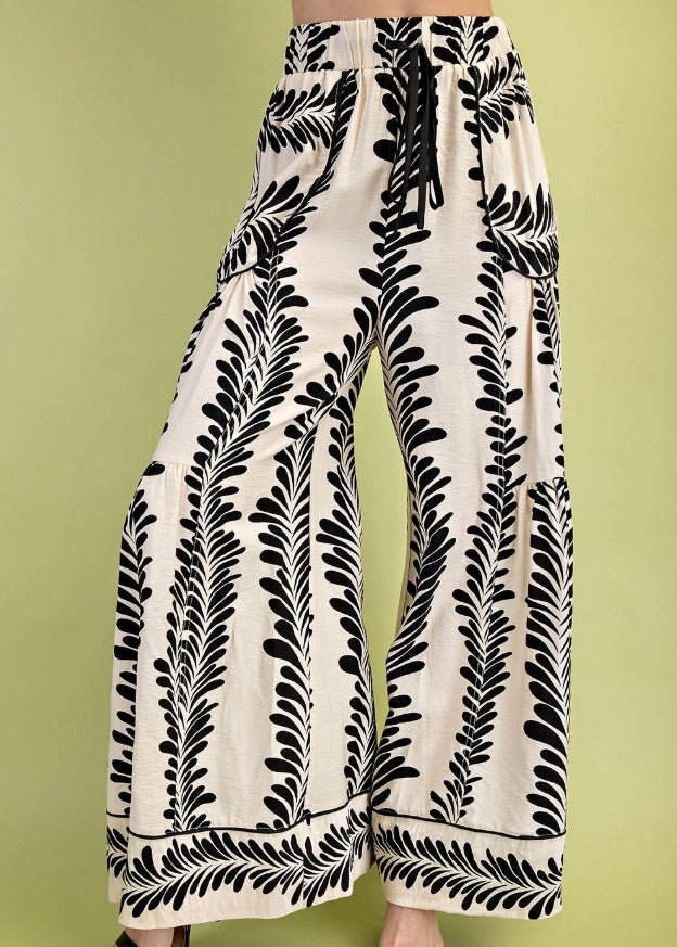 Printed Voluminous Wide Leg Pants with an Elastic Waist and Drawstring