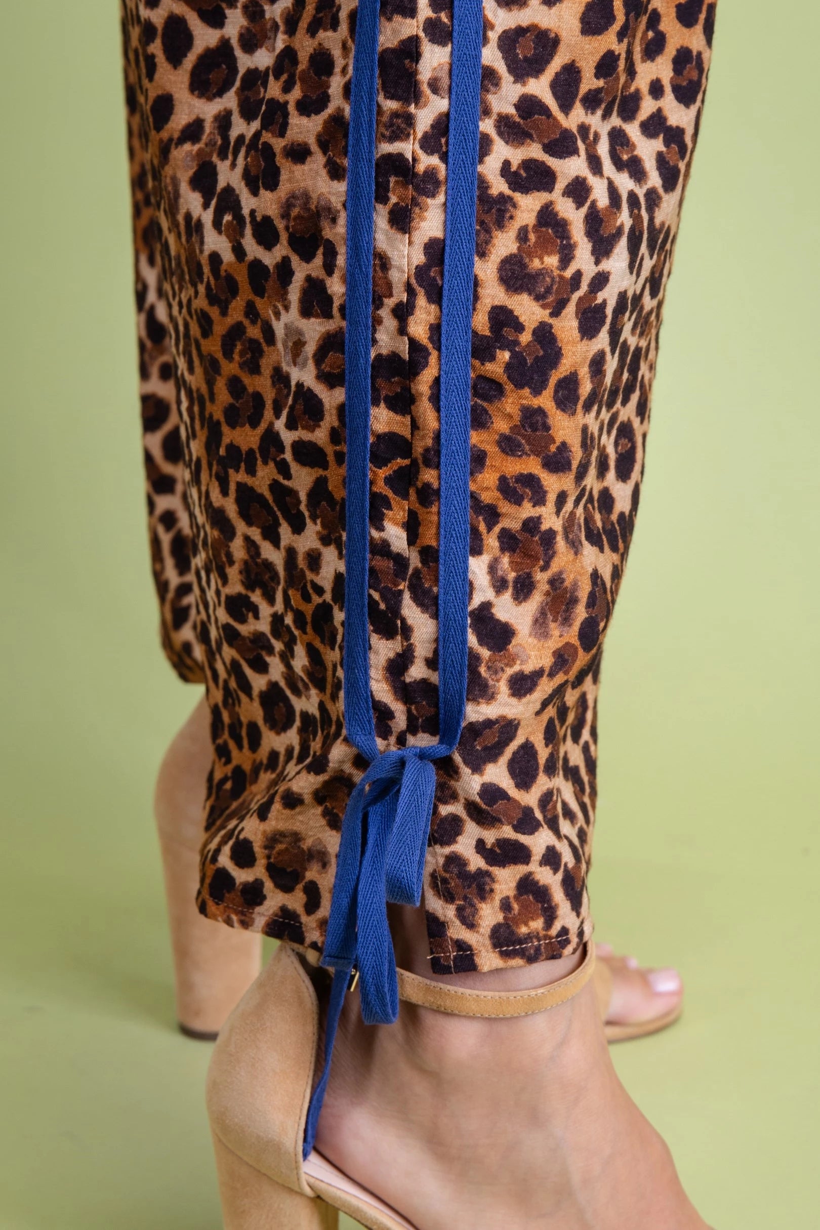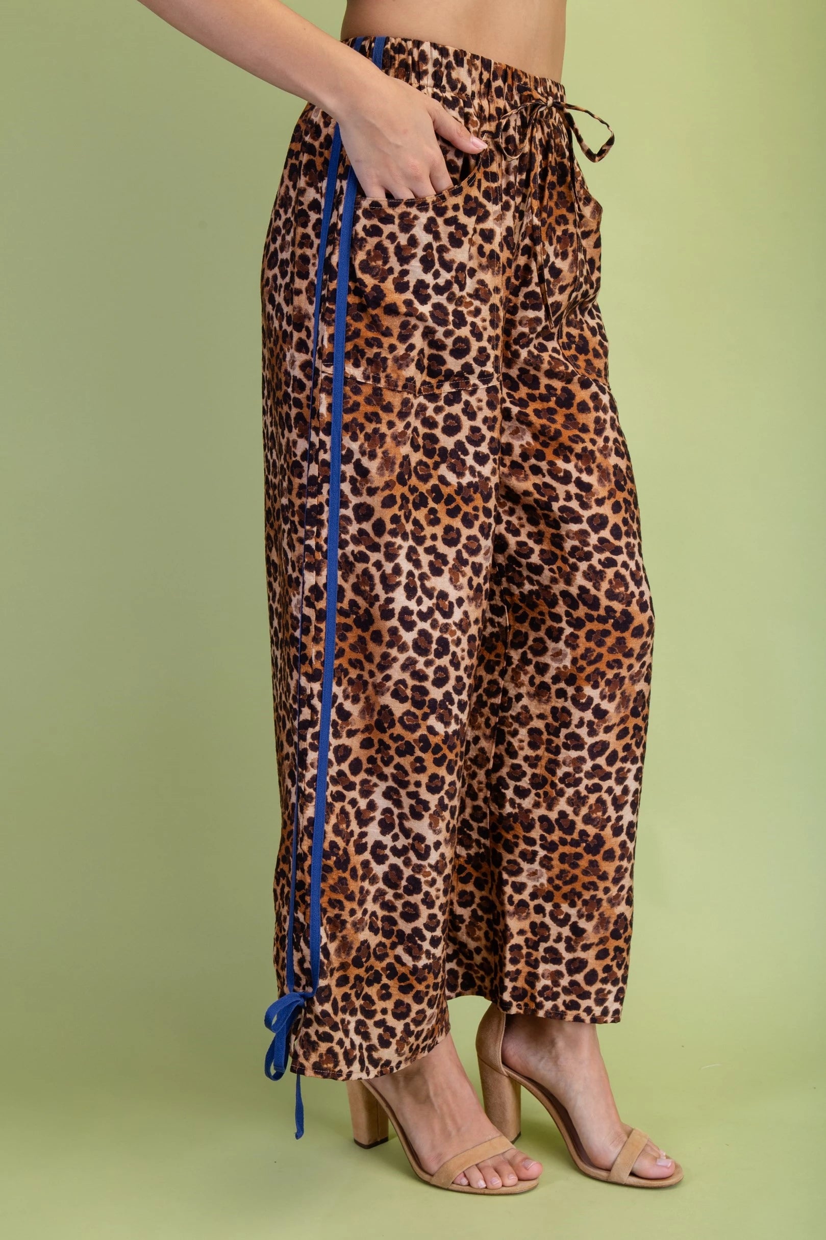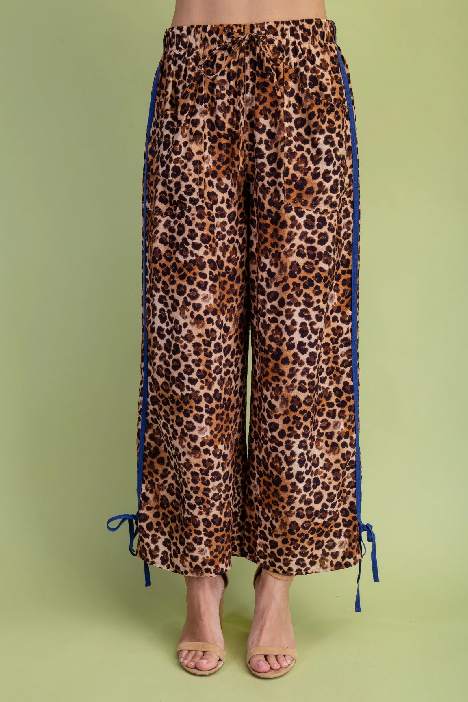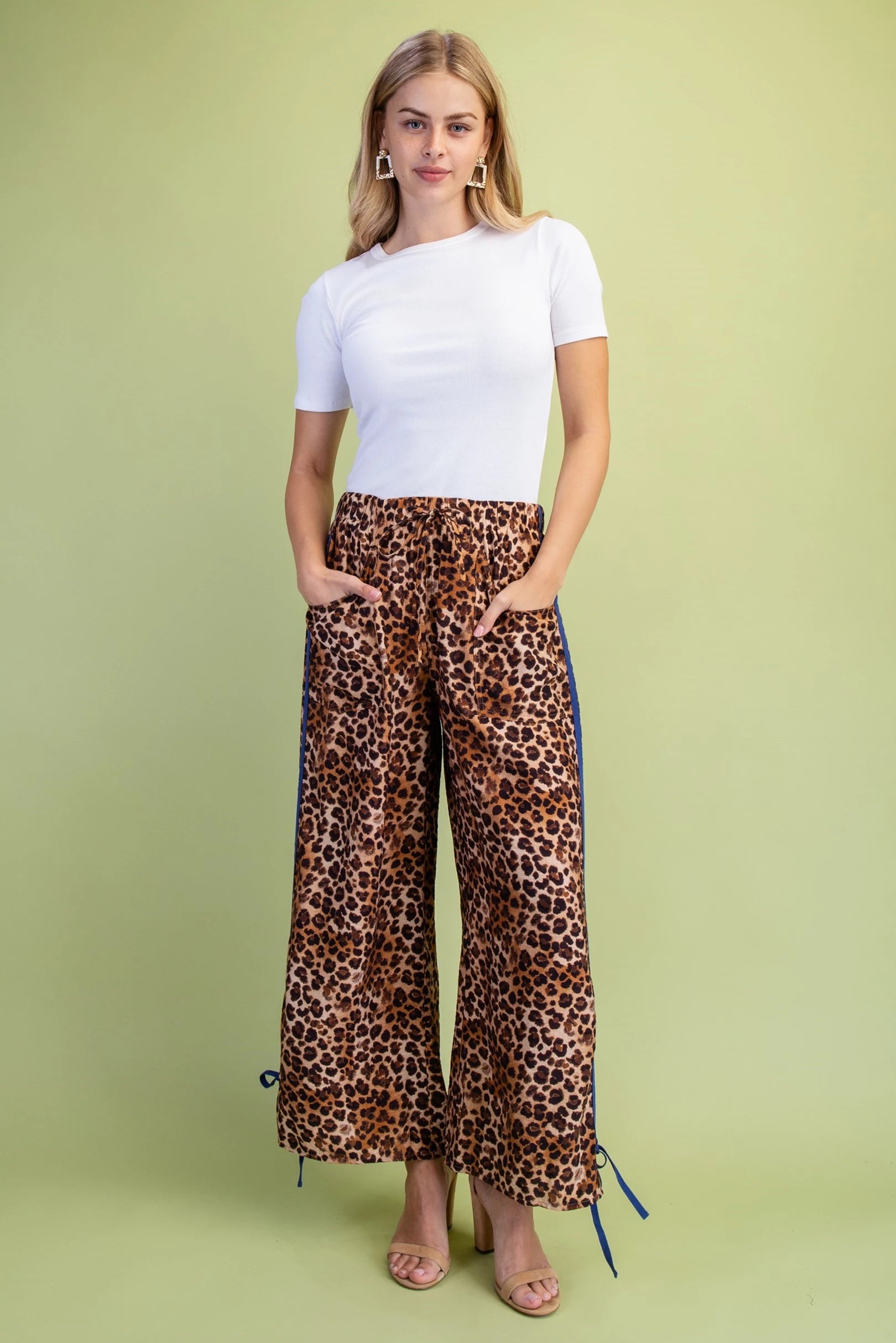 Leopard Print Relaxed Fit Pants with Contrasting Stripes Down the Side that Tie at the Hem