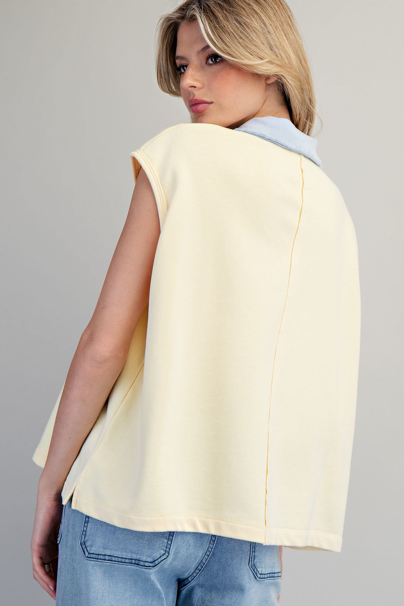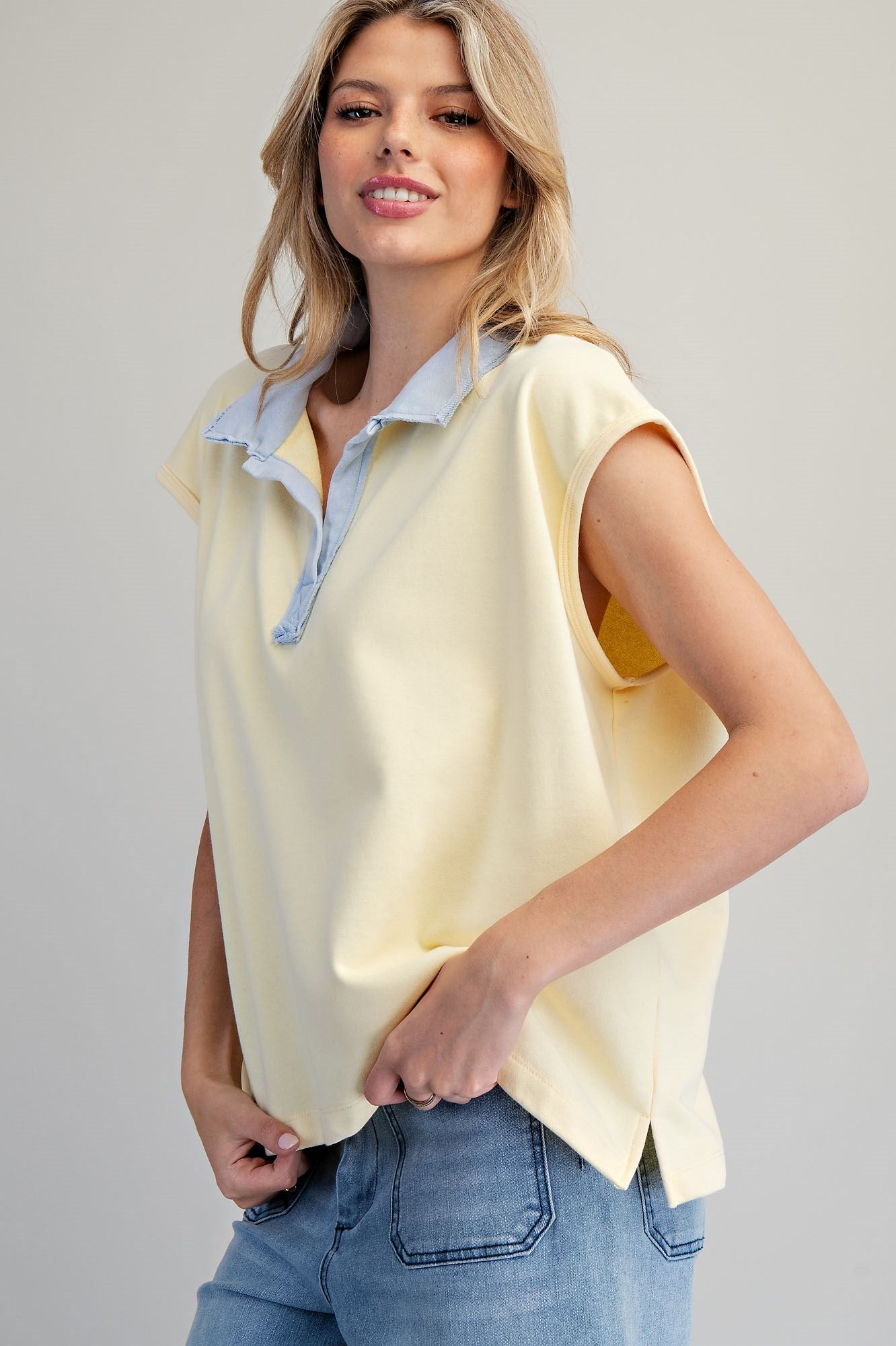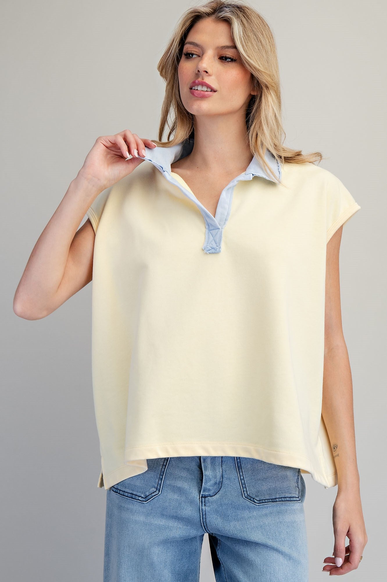 This relaxed fit top is designed with a classic contrast collar and a deep buttonless placket, featuring cap sleeves, side slit vents at the hem, and a clean finished vertical back seam for a modern, boxy silhouette.