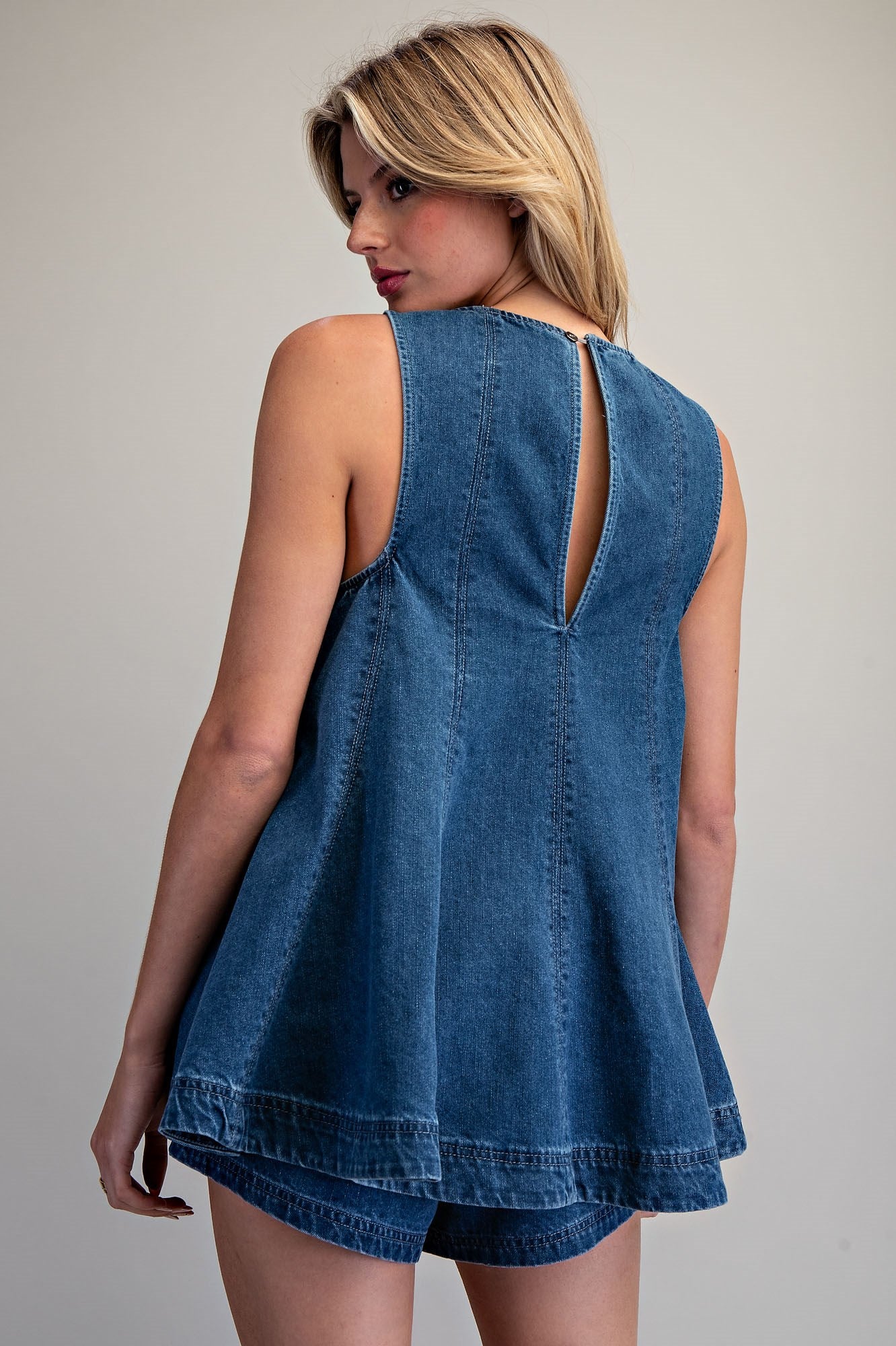 This sleeveless denim top features a high rounded neckline, exposed vertical seam detailing, a flared A-line silhouette, a wide hem panel finish, and a back button and loop closure that creates a small keyhole opening for a breezy, feminine look.